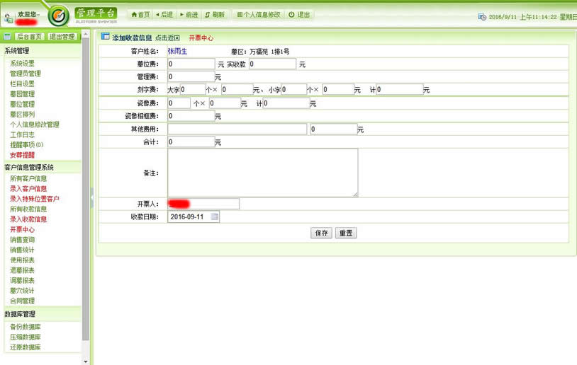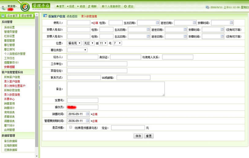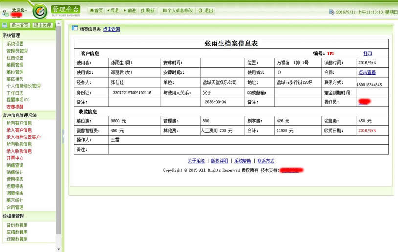 系统按照陵园的业务系统进行设计,组建陵园的企业生产管理系统;整个单位的业务流程,全部借助计算机来进行管理,结合先进的管理思想,借助现代计算机技术和方法,提升业务信息纵向横向传输效率和质量,实现墓地销售、结算管理(预售、退费)、客户管理、安葬管理、位置管理、合同管理、墓地管理期限到期提醒、二维码便民查询等进行全方位业务管理,具有各种统计、分析、查询、打印数据和报表的管理功能。提高陵园业务的办公效率和质量,让管理者随时监控本单位的运行状况,作出科学决策;可通过信息化手段规避不必要的风险(避免墓地的重复销售、到期信息的智能化提醒、欠费提醒及控制等),规范企业管理,从而提高办公效率,降低管理费用,提高企业形象,使企业的生产、经营信息得到及时反馈,从而有效管理、监督、控制企业经营活动,规避企业经营风险,为最终实现企业经营目标服务。
